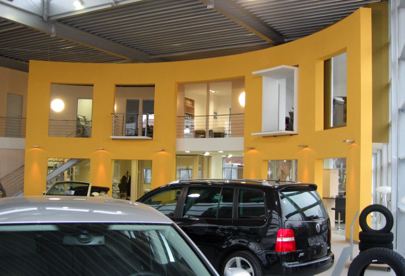 Eine moderne Pfostenriegelfassade im Inneren des Autohauses Schlagheck. Das "Haus-im-Haus-Prinzip" wurde von uns im Jahre 2007 fertiggestellt.